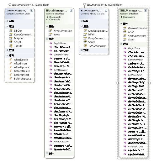 这里使用了.NET的泛型技术对数据层与逻辑层进行了封装,两层相对独立,互不依赖;它们包含了常用的CRUD的方法,每个方法都有一定的重载,也包括操作Relaion关系表的方法,以实现在同一个连接、同一个事务中对多个关系表的数据进行操作。