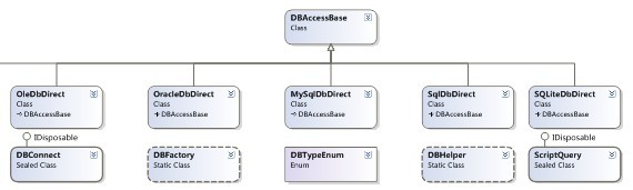 这是目前DevNet框架的数据层封装的类关系图的简化版,从上图中可以看到该数据层支持SQLServer、Oracle、OleDB、MySql、SQLite数据库,其中SQLite数据库的处理有一点区别,我会单独描述。